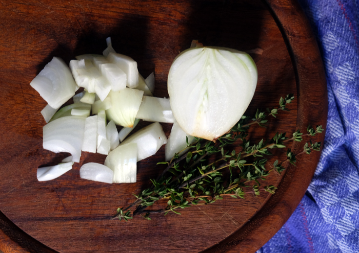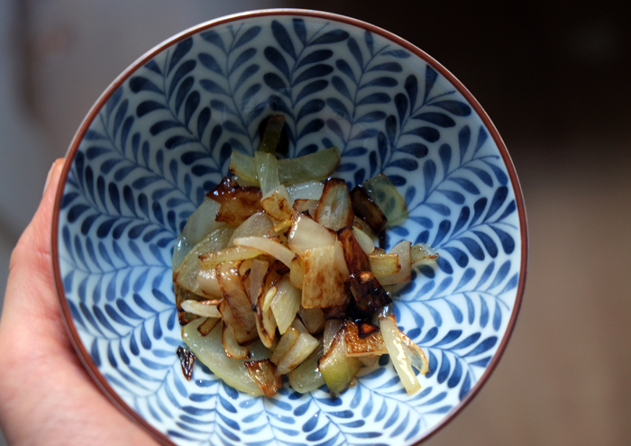 5. Nach etwa einer Stunde in einem Topf etwas Butterschmalz erhitzen. Die groben Zwiebelstücke darin goldbraun anrösten. Aus dem Topf nehmen und in eine kleine Schale füllen und beiseite stellen. Jetzt in dem verbliebenem Fett den Topinambur kurz anschwitzen und mit Wasser anschließend aufgießen, Salz dazu geben und wie Kartoffeln weich kochen.