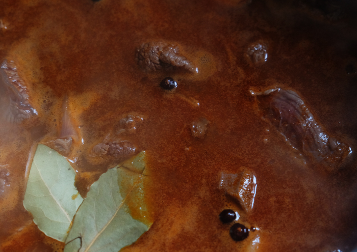 10. Das Ragout, wenn das Fleisch weich ist und zerfällt, mit Salz, Pfeffer (und Zucker) abschmecken.