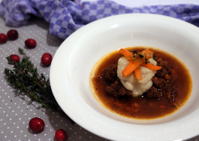 3. Zugedeckt 2 Stunden schmoren bis das Fleisch zerfällt. Inzwischen Möhren schälen, waschen und wirklich fein würfeln. Möhren mit Cranberrys nach 1 Stunde dazu geben.