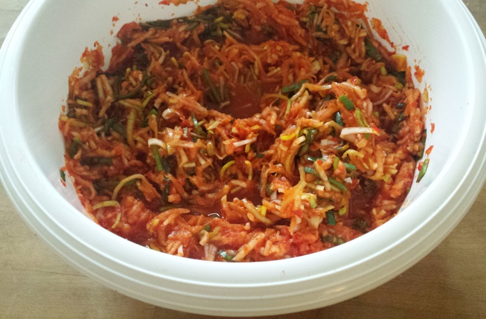 Das Kimchi meiner Mutter ist relativ mild und schmeckt sehr frisch. In den südlichen Regionen essen sie das Kimchi eher schärfer und insgesamt auch sehr viel würziger. Für mich ist das Kimchi meiner Mutter das weltbeste und von daher hatte ich mich bisher noch nie getraut, in ihre großen Fußstapfen zu treten. Bis zum letzten Heimatbesuch an Weihnachten. Da habe ich mich endlich neben meine Mutter gestellt, als sie wieder einmal Kiloweise Kimchi einlegen wollte, und mir beibringen lassen, wie man diesen geheimnisvollen Chinakohl zubereitet.