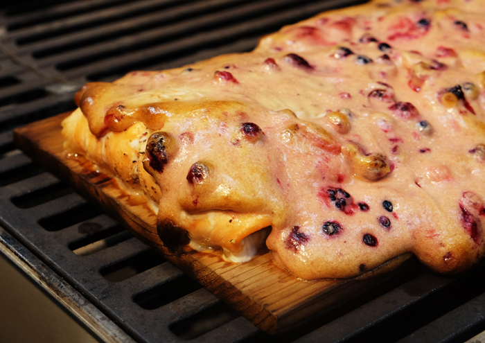 Schottisches Lachsfilet Loch Duart vom Zedernholzbrett, Waldbeeren-Glasur, Meerrettich Creme und Grillkartoffel-Stampf