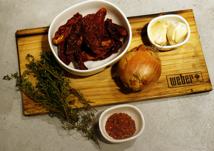 Saftiger Beef-Burger mit aromatischen Dörrtomaten auf dem Röstbrot mit süßen Zwiebeln und BBQ Sauce