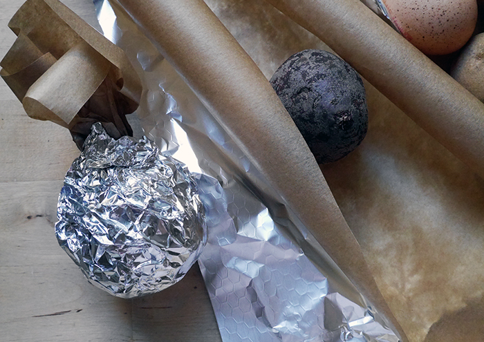- Die Rote Bete in Backpapier und Alufolie einwickeln und für 40 – 50 Minuten im Ofen bei 200 Grad weich backen und anschließend mit kaltem Wasser abschrecken und schälen.