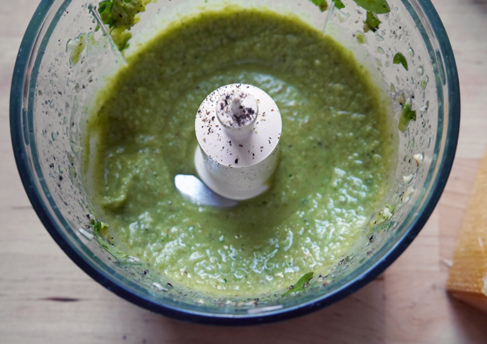 - Für das Walnusspesto alle Zutaten (Knoblauchzehe, Walnüsse, Basilikum, Bergkäse, Olivenöl, Salz, Pfeffer, Zitronensaft) in einem Mixer zu einer cremigen Masse zusammen mixen.