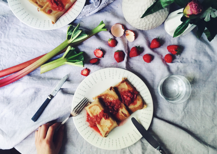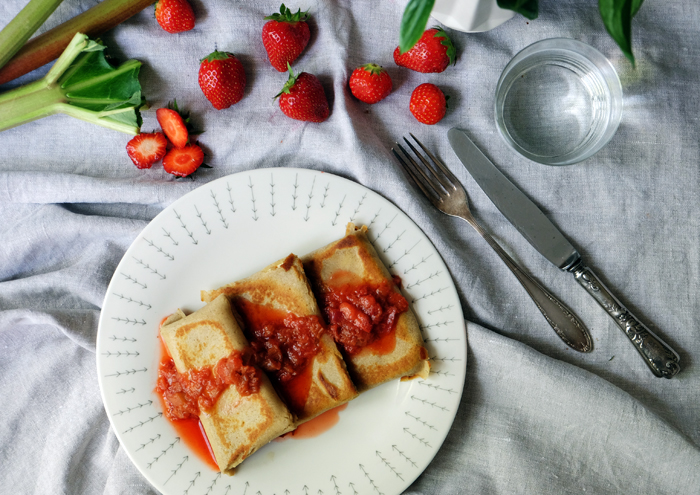 Endlich ist nicht nur Rhabarber-, sondern auch Erdbeerzeit. Auf dem Markt am Samstag habe ich Pfälzer Erdbeeren gekauft, die schon wunderbar süß gerochen haben und natürlich habe ich auch wieder Rhabarber gekauft. Beides zusammen ist die perfekte Frühlingskombination. Also musste ich diesen Sonntag einfach mit einem süßen Frühstück starten und habe mal kein Mittagsgericht gekocht. Die Blinis eignen sich natürlich auch für eine Kaffeerunde am Nachmittag bei Sonnenschein auf dem Balkon oder im Garten.