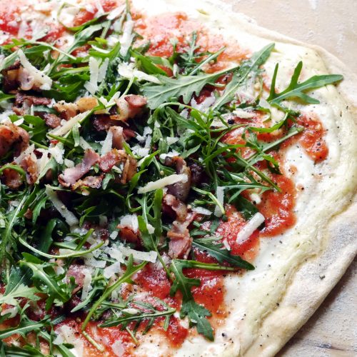 Daher hier nun das Gericht für euch: Flammkuchen wie Pizza mit passierten Tomaten und Rucola