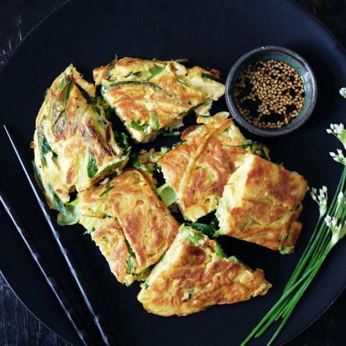 Ich war leider noch nicht in Korea und konnte bislang nur bei Su oder in koreanischen Restaurants in Berlin in den Genuss der tollen Küche kommen. Heute gibt es ein Sonntagsgericht, dass super einfach nachzumachen ist, Korea nach Berlin holt und dennoch nicht so fremd von den Zutaten ist und sich auch ohne die besonderen koreanischen Zutaten zubereiten lässt. Su hatte schon mal ein Gericht für einen koreanischen Pfannkuchen mit Meeresfrüchten vorgestellt. Auch beim Hobak Jeon ist die Basis Mehl, Wasser und Ei. Beim Hobak Jeon kommt allerdings Zucchini in den Teig. Ich habe noch etwas Frühlingszwiebeln, Schnittknoblauch und Chili hinzugefügt. Das Gericht eignet sich für ein schnelles Abendbrot oder auch Lunch.