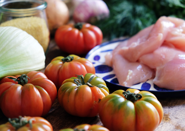 Guten Appetit!Zuaten mit Marindatomaten Hühnchenspieße Kräuter mit Hirse mischen Schnelles Sonntagsgericht mit Spießen Hühnchen mit Fenchel und Hirse