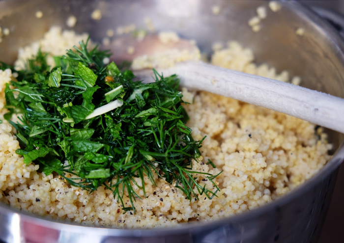 6. Tomaten und Kräuter mit der Hirse mischen und mit Salz und Pfeffer abschmecken.