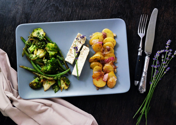 5. Wenn alles fertig ist, den Feta aus dem Ofen holen und dicke Streifen schneiden. Auf einem Teller die Bratkartoffeln und das grüne Gemüse anrichten, das Pesto über das grüne Gemüse geben, den Feta dazu geben und alles servieren solange der Feta noch warm und leicht angeschmolzen ist. Feta mit Thymian und Lavendel Kartoffeln goldbraun braten Lavendelfeta mit Brokkoli und Bratkartoffeln