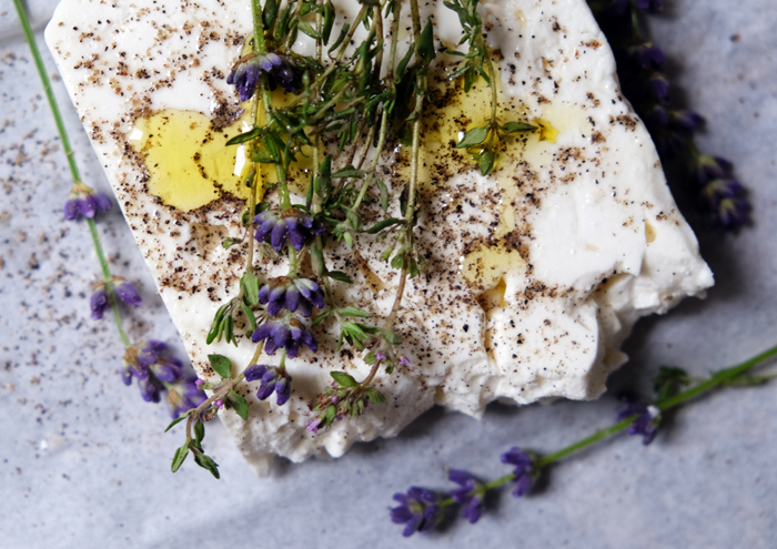 3. Backofen auf 180°C Ober- und Unterhitze vorheizen. Feta auf ein halbes Backpapier geben. Mit Pfeffer würzen. Einen Schuss Olivenöl und etwas Zitronensaft über den Feta geben. Lavendelzweige und die restlichen Thymianzweige um den Feta geben. Feta mit Backpapier umwickeln und ein kleines Päckchen machen. Auf dem Rost für etwa 15 Minuten backen.