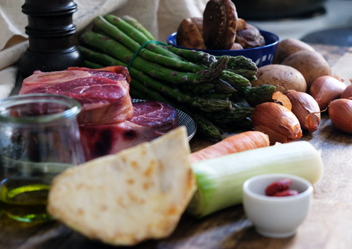 Heute gab es mal wieder ein Sonntagsgericht, das den Namen wirklich wert ist. Deftig und etwas aufwendiger kam diesen Sonntag Rinderhesse mit dem Frühlingsgemüse schlechthin – Spargel, klar was sonst? – und Polenta auf den Tisch. Die Zutaten kommen dieses Mal nicht vom Markt, denn bereits ein paar Tage vorher als ich mir im LPG Merguez gekauft habe und auf das Etikettieren an der Fleischtheke warten musste, lagen da direkt vor mir diese Beinscheiben vom Rind und wanderten, da leerer Magen, großer Hunger, also auch in den Korb. Dieser Teil vom Rind ist übrigens recht günstig, geschmacklich dennoch sehr kräftig und wenn man es als Schmorgericht zubereitet auch noch wunderbar zart. Also ruhig mal auch andere Teile als immer nur das Filet in die Pfanne schmeißen.