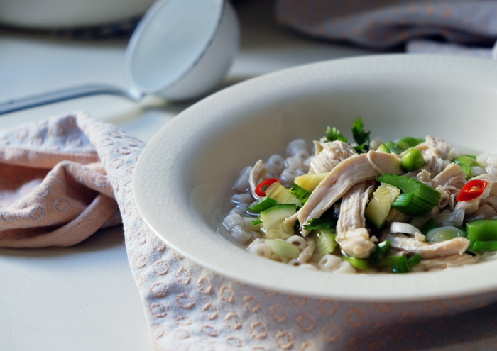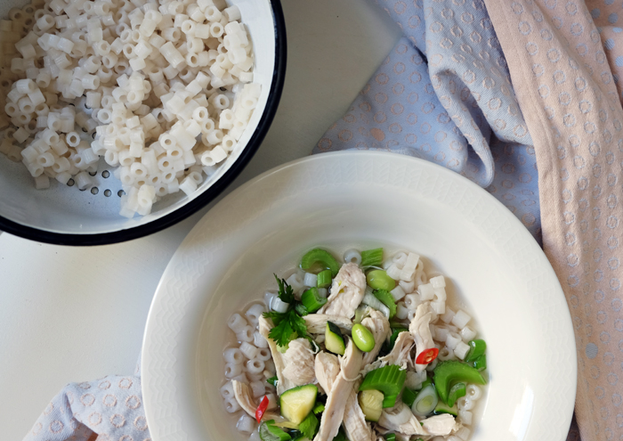 Wer mehr Zeit hat, kann seine Brühe auch selber herstellen und ein ganzes Suppenhuhn abkochen. Aber diese Variante der Frühlingssuppe eignet sich perfekt für ein schnelles gesundes Abendbrot und könnte sogar auch in einer Büroküche gezaubert werden. Meine Ration für das morgige Mittagessen habe ich bereits in einem Schraubglas verschlossen. Nur die Nudeln muss ich dann morgen noch frisch dazu geben. Ich empfehle daher auch die Nudeln nicht direkt in den großen Topf zu geben, sondern direkt in den Teller, da sie in der Suppe nur aufweichen und matschig weich werden.