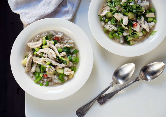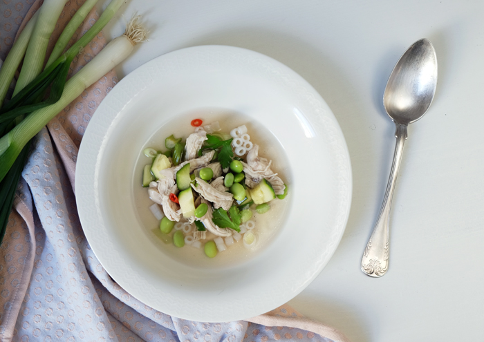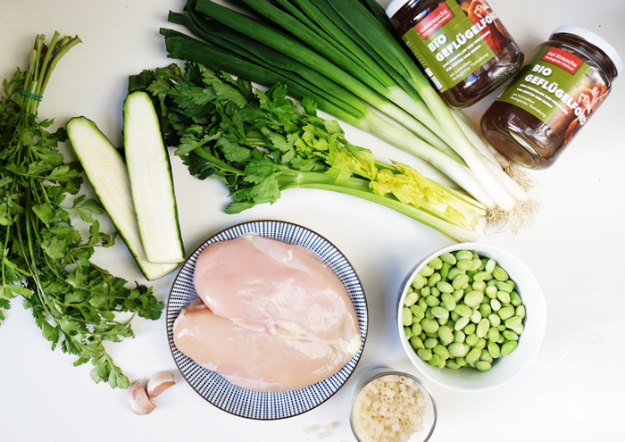 - Wenn das Hühnchen gar ist und herausgenommen wurde, Sellerie und Zucchini in den Topf geben und für ca. 3 Minuten garen, anschließend die Sojabohnen und Chili dazu geben und 1 weitere Minute garen. Fleisch und Frühlingszwiebeln wieder in den Topf geben und mit Salz und Pfeffer würzen.