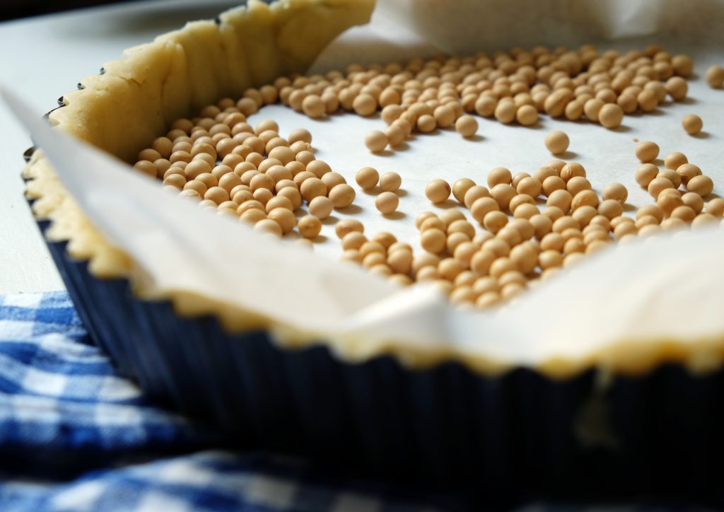 - Währenddessen eine Quiche-Form einfetten. Mürbeteig aus dem Kühlschrank nehmen und auf einer bemehlten Fläche dünn ausrollen. Mit Hilfes des Nudelholzes den Mürbeteig in die Form transportieren und den Teig an den Rändern gut festdrücken. Überstehenden Teig entfernen. Mit einer Gabel mehrmals einstechen und mit Backpapier und getrockneten Hülsenfrüchten den Teig beschweren. Anschließend den Spargel aus dem Ofen nehmen und den Mürbeteig bei 200°C auf der mittleren Schiene im Backofen vorbacken.