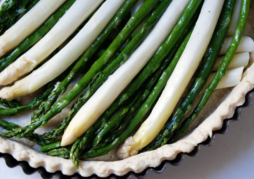 - Ein paar weiße Spargelstangen in Stücke schneiden. Mürbeteig aus dem Ofen nehmen und kurz abkühlen lassen.