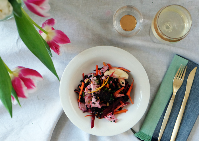 Perfekt an kalten Wintertagen und wenn es nicht viel frisches Gemüse gibt, ist dieser Salat etwas Besonderes und schmeckt schon ganz nach Frühling. Knackiges Wurzelgemüse mit Orangen, Dill und zartem Hühnchen. Da ist alles an Geschmack dabei. Am besten kauft man das Wurzelgemüse direkt auf dem Markt vom Bauern aus der Nähe.