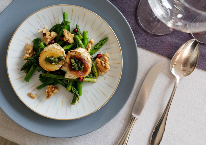 Weil es heute für das Dinner als Vorspeise Spargel mit Ziegenkäse geben sollte, habe ich das direkt am Samstag für das heutige Sonntagsgericht ebenfalls gemacht – quasi eine Generalprobe. Bei mir gab es allerdings noch Lamm vom Markt dazu. Zum Junggesellinnenabschiedsdinner (wow, was für ein Wort) gab es das ganze heute in einer vegetarischen Version mit karamellisierten Walnüssen, Granatapfel und Bärlauchpesto.Vegetarische Version mit Ziegenkäse und Spargel