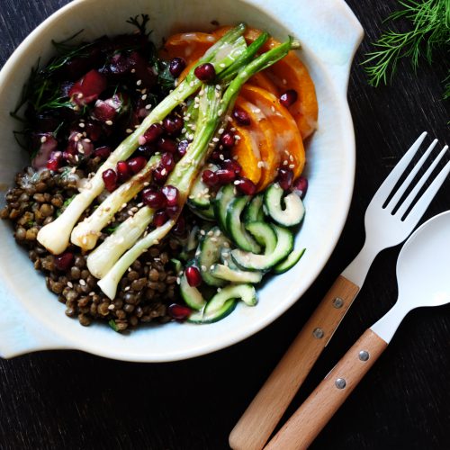 Sonntagsgericht: Vegane Bowl mit Linsen, Kürbis und Roter Bete